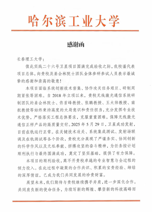 近日,我校收到哈尔滨工业大学发来的感谢信,信中对学校及中国工程院姜会林院士团队全体参研参试人员为实践二十六号卫星作出的突出贡献,表示诚挚谢意。
