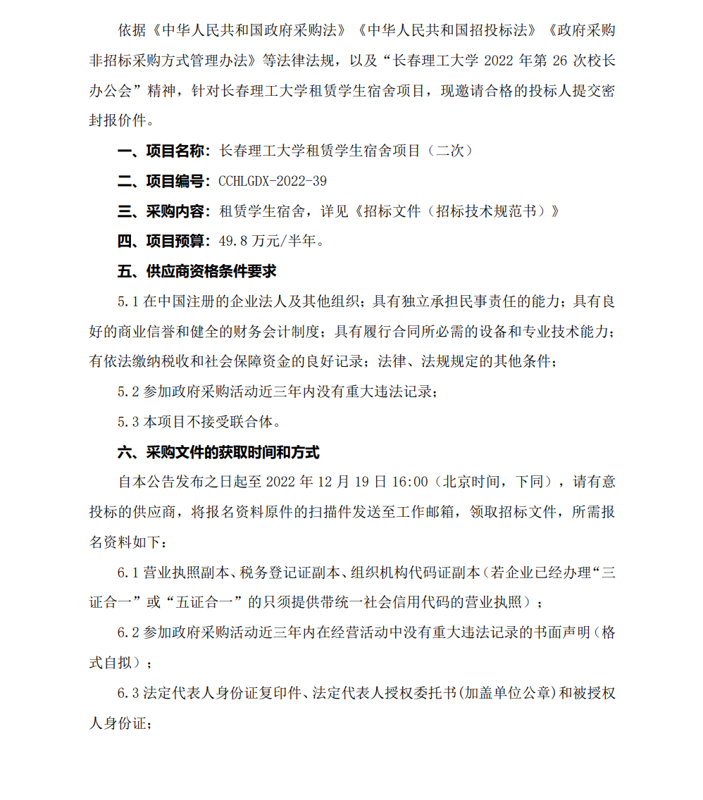 长春理工大学租赁学生宿舍项目(二次)招标公告