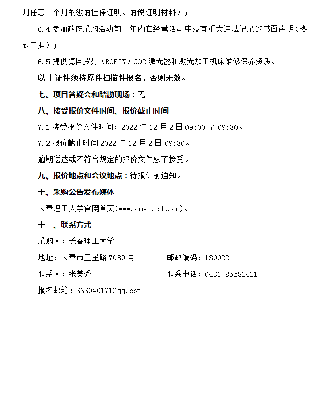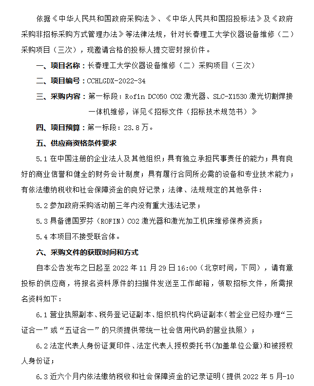 长春理工大学仪器设备维修(二)采购项目(三次) 竞争性谈判公告