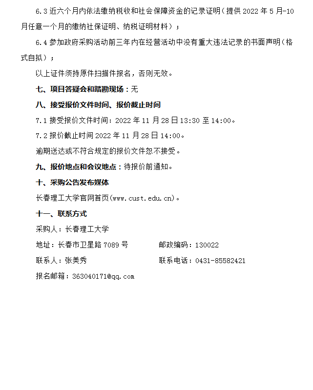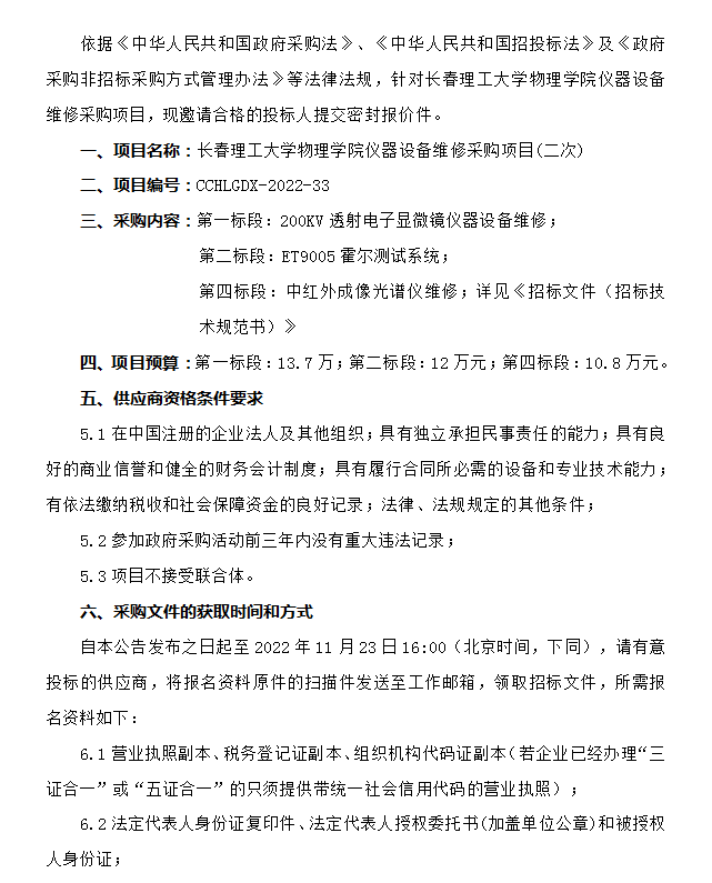 长春理工大学物理学院仪器设备维修采购项目(二次) 竞争性谈判公告