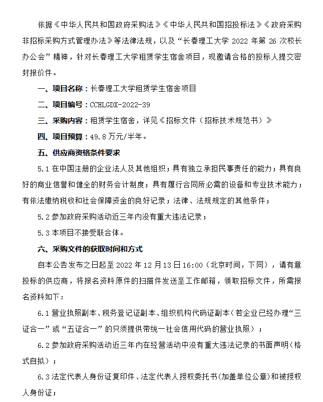 长春理工大学租赁学生宿舍项目招标公告