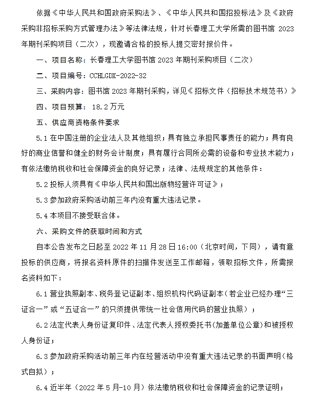 长春理工大学图书馆2023年期刊采购项目(二次)竞争性谈判公告