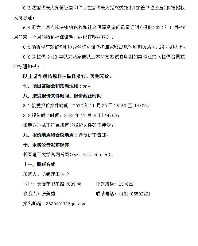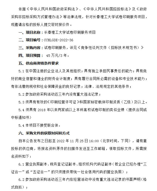 长春理工大学试卷印刷服务项目竞争性谈判公告