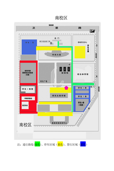 5.南校区两个学生宿舍区域实行交通管制。东门、北门均可双向通行,社会车辆有序停放于各停车场。